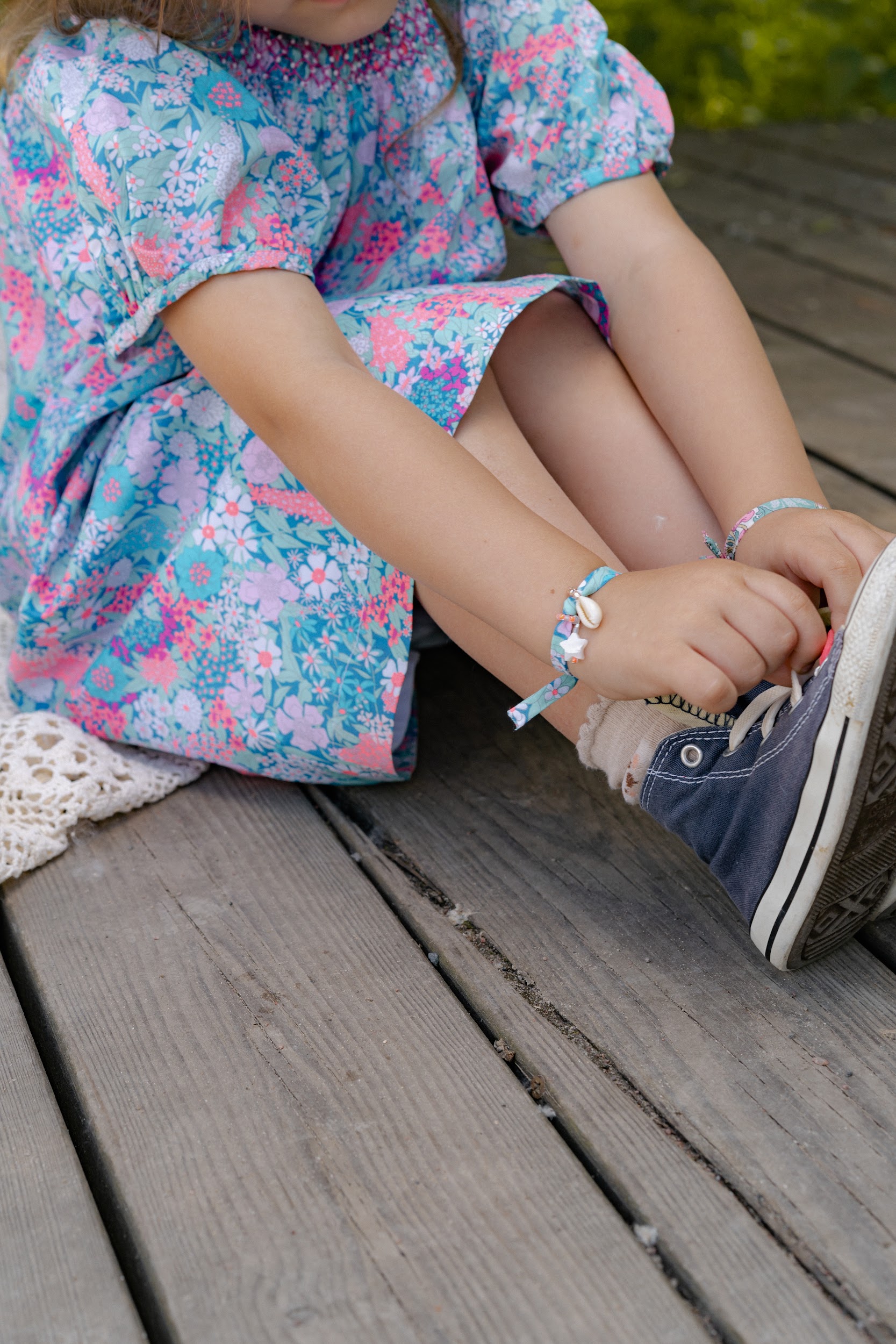 Браслет ручной работы из коллаборации с брендом украшений «МаМи» сделан из хлопка Либерти, украшен натуральной ракушкой и звездочкой из настоящего перламутра. При создании этого дропа мы вдохновлялись воспоминаниями о летних приключениях: каникулы у бабушки, долгожданные поездки к морю, долгие прогулки с друзьями и веселые игры в парке. Закройте глаза и вспомните, как это было! Все эти трепетные эмоции как нельзя лучше передают дух и настроение коллекции! Украшения с основой из текстиля, выполненные из той же ткани, что и знаковые образы La petite Lucie. Мы целенаправленно выбирали материалы, которые устойчивы к воздействию воды, песка или пота, что делает изделия идеальными для активного летнего отдыха. Каждая деталь украшения ассоциируется с летним настроением, атмосферой радости и беззаботности
